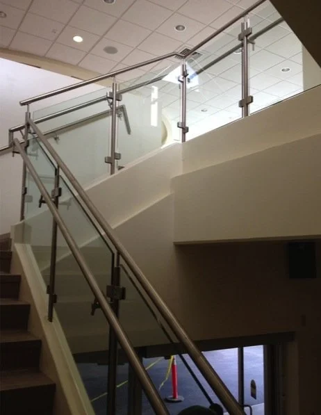 Our crews also installed several hundred feet of Railcraft Aluminum Guardrails and Handrails. The Railcraft Guardrail was embedded into the concrete parapet wall to a finish height of 42" from the stair tread elevation (as per code). The architect also specified matching handrails to be fascia-mounted to the wall, allowing (potentially light-headed) donors and patients safe passage down the staircases.