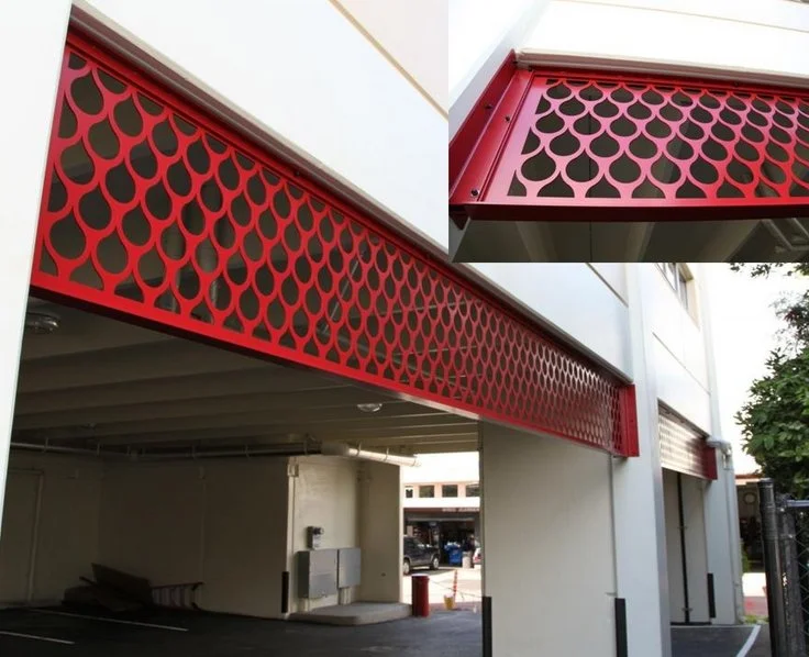 Below you see more custom-designed and custom-fabricated decorative panels accenting the mauka elevation of the ground floor. Railcraft International (the manufacturer) used a high-pressure water jet to create the blood drop "cutout" design specified by the architect. After the solid aluminum paneling was cut and framed in, each panel was powder-coated with our corrosion proof AAMA 2605 certified D3000 coating.