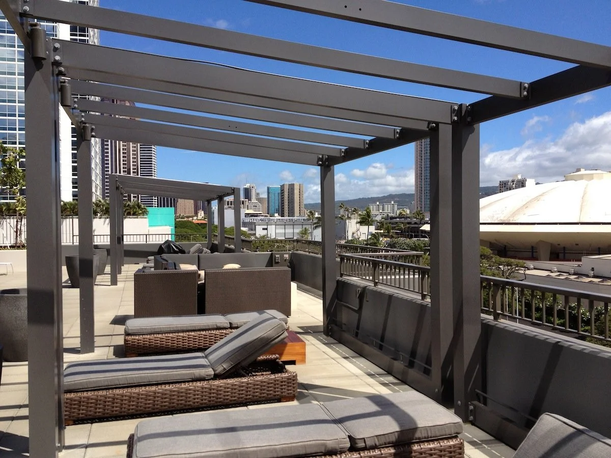 At The Pacifica in Honolulu, custom designed Railcraft trellises were installed throughout the pool deck area, providing a contemporary modern touch to an otherwise mundane and plain concrete deck.